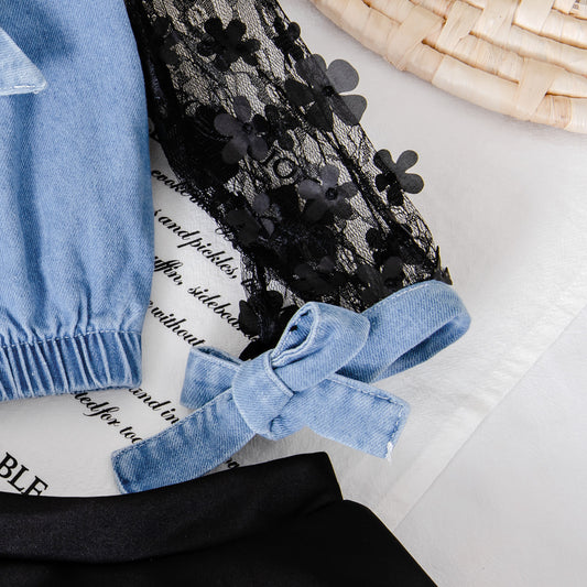 Off-the-shoulder Jumpsuit Girls Ruffled Blue Denim Romper
